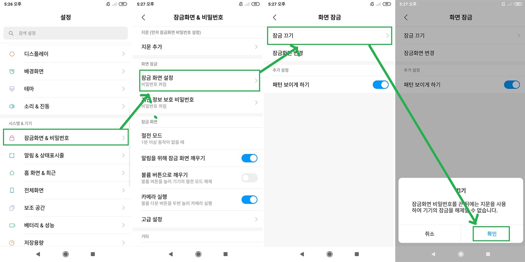 설정 -> 잠금화면&비빌번호 -> 잠금 화면 설정 -> 잠금끄기 -> 확인 -> 끝